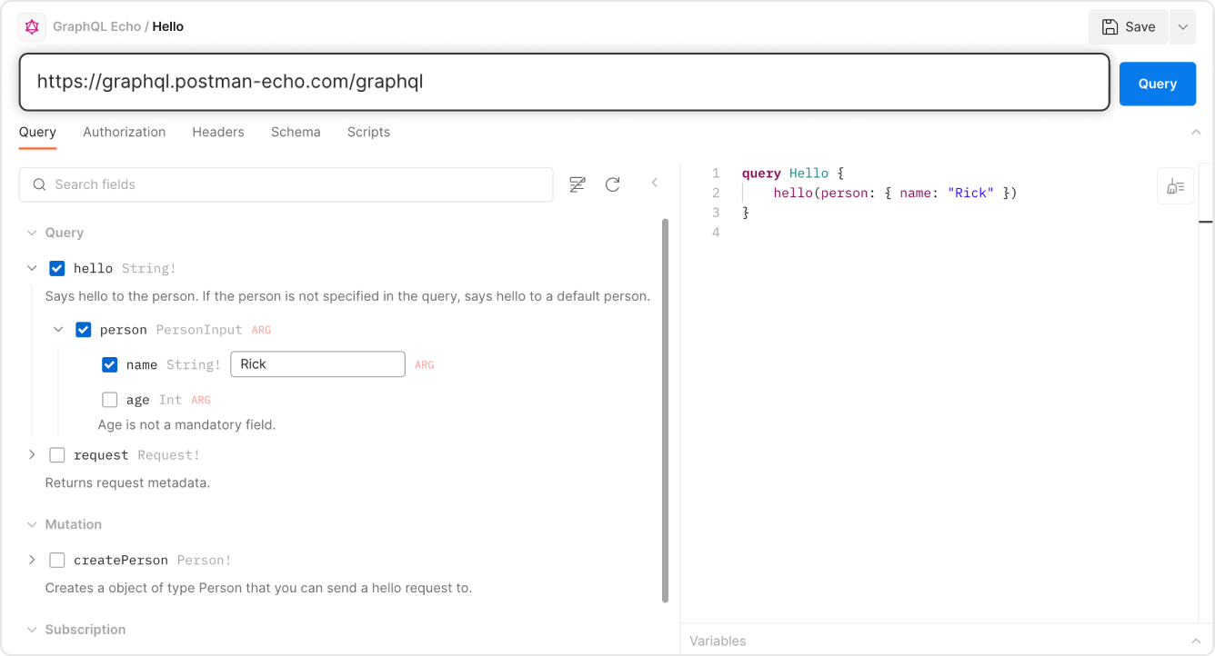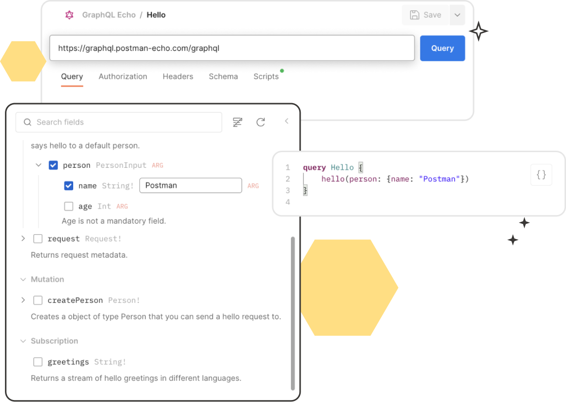 The Postman GraphQL client, which expands on Postman's core API client functionality, offers a powerful and efficient way to work with GraphQL APIs. With Postman's GraphQL client, you can: