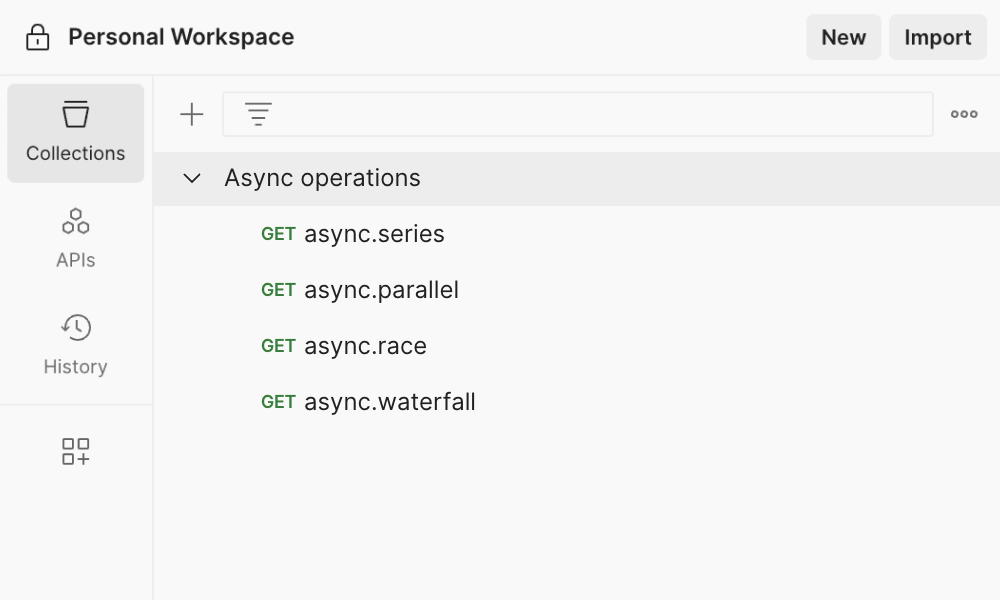 The asynchronous operations template contains sample requests and functions that demonstrate how to set up and execute asynchronous operations in Postman. These examples showcase how to handle asynchronous tasks in your API workflow, allowing you to optimize the processing of requests and responses. The template includes the following functions -