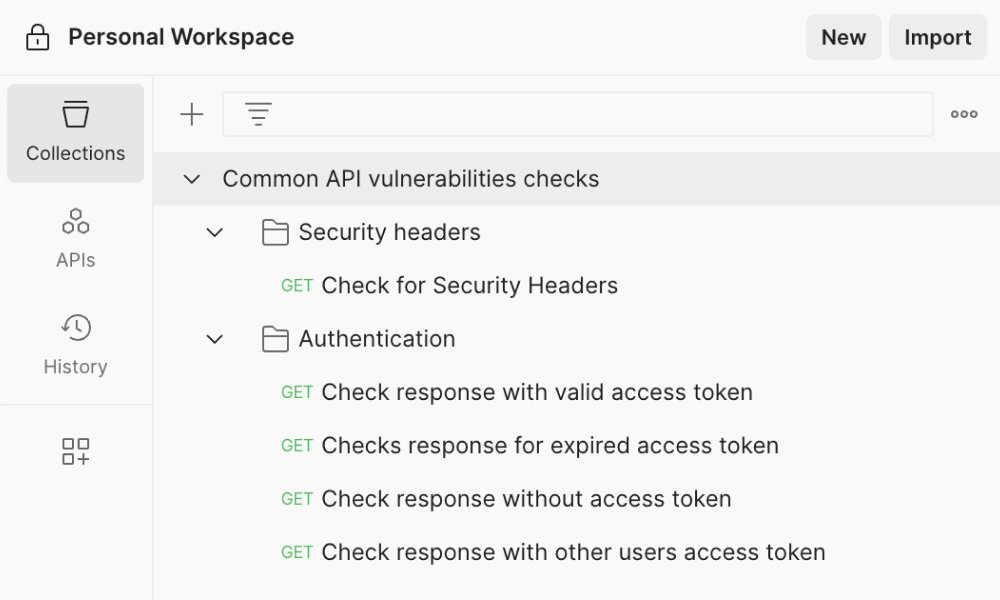 The template contains pre-configured requests with test scripts that enable you to check your API for common vulnerabilities. It provides a set of tests and checks for various security vulnerabilities, including: