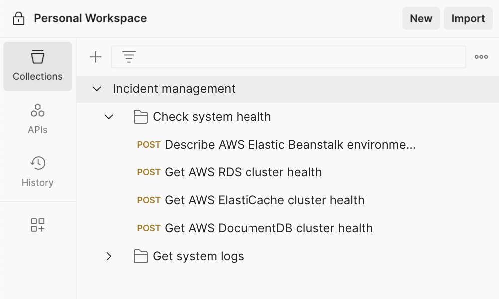 The incident response management template provides a comprehensive set of resources to assist in managing and responding to incidents effectively. It includes pre-configured requests that allow you to perform various checks and gather system health information for AWS Elastic Beanstalk environments, Amazon ElastiCache clusters, and more. It also helps retrieve system logs from AWS CloudWatch, New Relic Service, and other relevant sources. By utilizing this template, you can accelerate your incident response efforts and resolve issues faster.