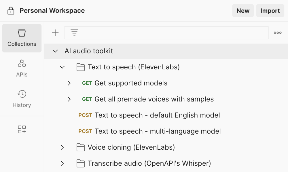 This template contains ElevenLabs and OpenAI API endpoints that help you fetch details of available models, generate audio from text, clone voices, and transcribe audio files. Using these endpoints, you can create applications with virtual assistants, audiobooks, voice services, and other audio-related tasks across industries.