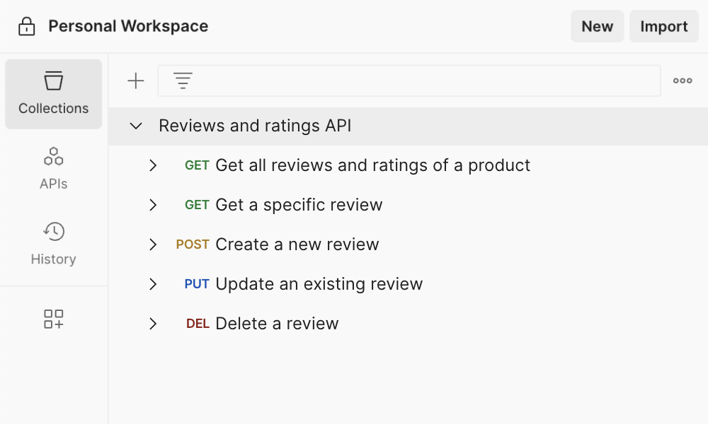 This template helps you define and group endpoints for the core features of a reviews and ratings API. You can use it as a reference for structuring your API and customize it by including features like review sorting and analytics.