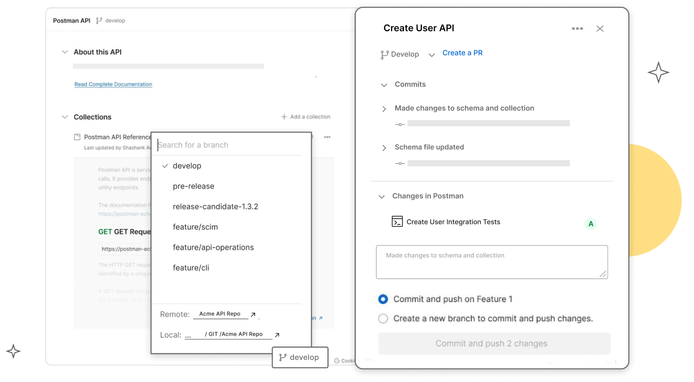 With Postman's native Git support, the API Builder connects to the source code repository to automatically maintain API documentation, tests, and specifications alongside code. Developers can access API assets in a local development folder for use across local tools—like IDEs, Postman CLI, proxies, and linting tools—during design, development, and testing.