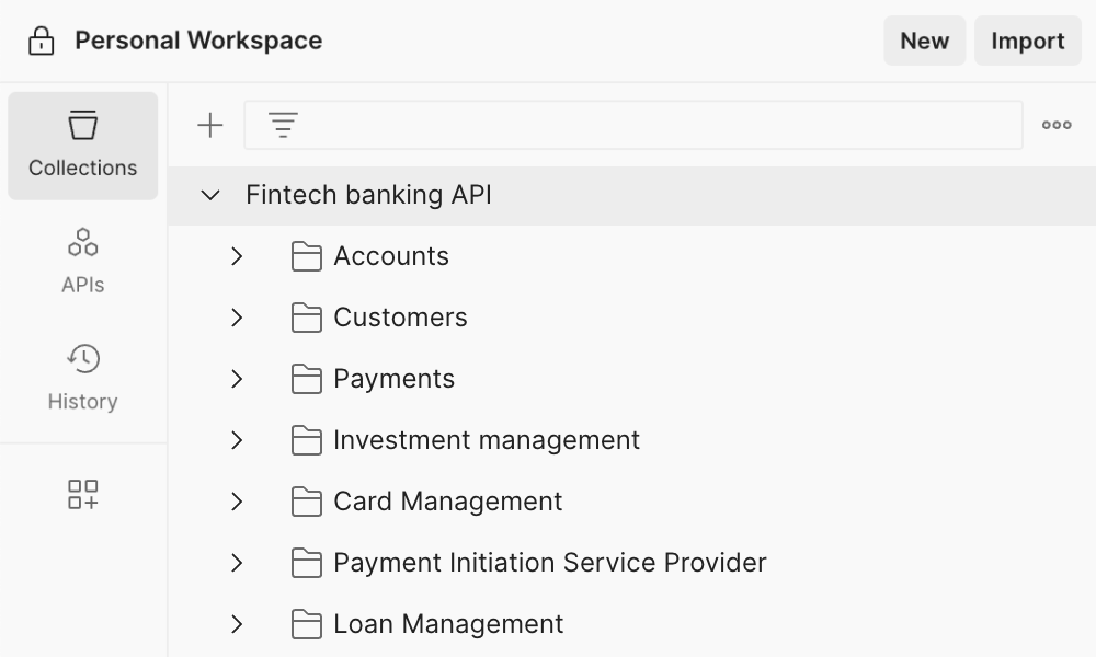This template helps you define and group endpoints for the core features of a fintech banking API. You can use it as a reference for structuring your API and customize it by including features like card management, analytics, and user management.
